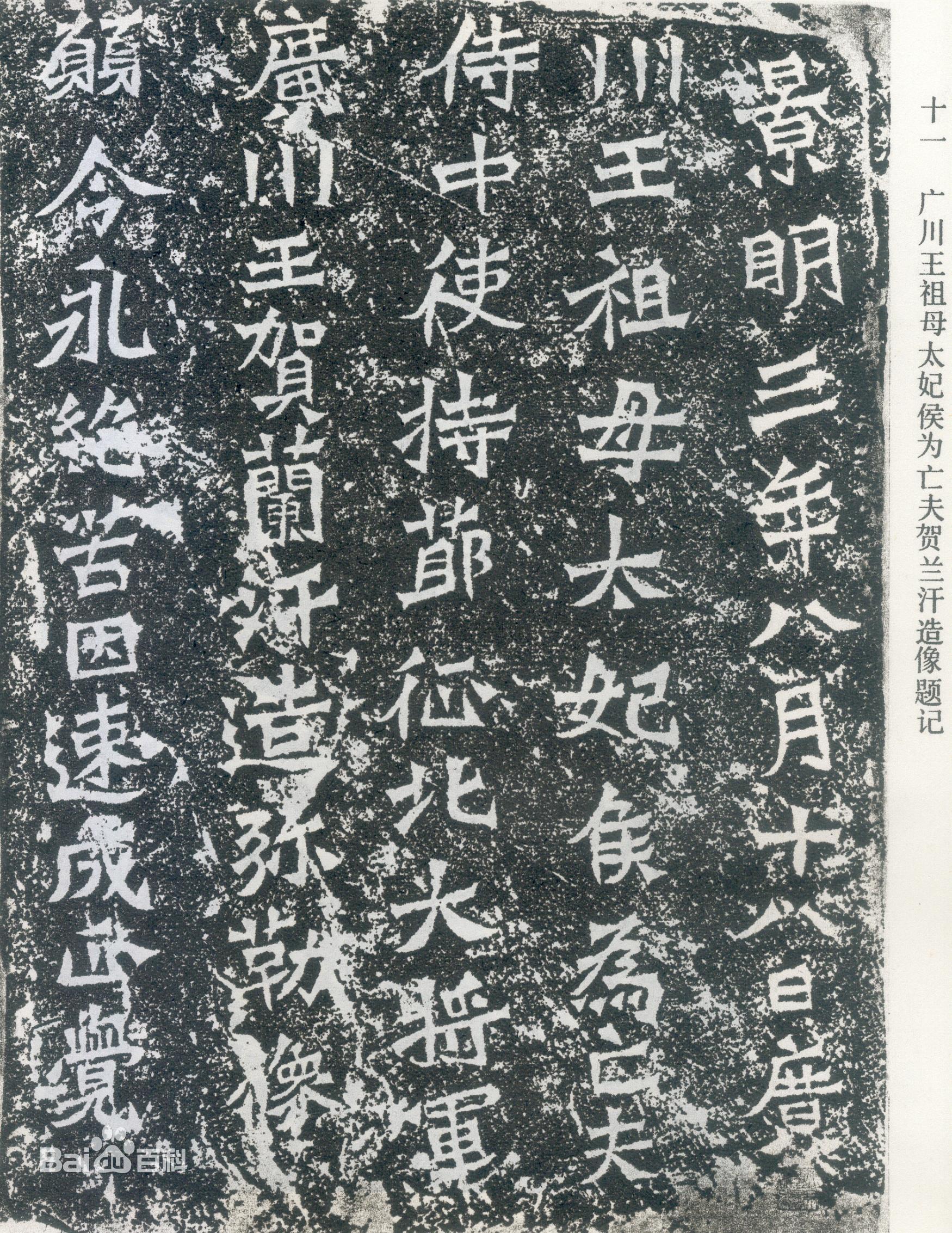 《贺兰汗造像记》,全称《广川王祖母太妃侯为亡夫贺兰汗造像题记》。属“碑式”题记,有额无字,螭图盘绕。名列《龙门二十品》之中。 《贺兰汗造像题记》,题记高50厘米,宽35厘米。通篇50字,一气呵成,以隶法入书,面目俊俏伟健,气韵贯通汉晋,笔法奇逸,刀法朴茂方拙。史载广川王曾世袭三代,第一代贺兰汗于延庆二年(472年)被封为广川王,位中都大官,太和四年(480年)卒。其子谐袭位,太和十九年(495年)谐病故,高祖孝文帝曾“素服深衣哭之”。后其子灵遵再袭爵第三代广川王。在这里,侯太妃是为亡夫、第一代广川王贺兰汗造像,当时已是景明三年(502年),贺兰汗也已死去22年,侯太妃成为祖母了。造像记碑位于古阳洞窟顶东侧中间位置,盘龙首,长方座,造像龛位于窟顶东南侧,二龛并列。与造像记紧邻的左龛,高100厘米、宽64厘米、深8厘米。右侧龛高80厘米、宽75厘米、深8厘米。左龛主尊为戴寇交脚弥勒,右侧龛内三尊造像与左龛相同,两龛顶外均有四比丘。此龛完成于景明三年八月十八日。释文:景明三年八月十八日,广川王祖母太妃侯为亡夫侍中、使持节、征北大将军、广川王贺兰汗造弥勒像,愿令永绝苦困,速成正觉。