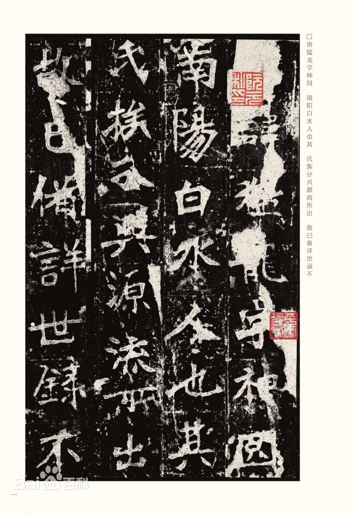 《张猛龙碑》碑高280厘米,宽123厘米,其中碑身高153厘米,宽87厘米,碑额高44厘米,宽40厘米。碑额三行12字。碑阳26行,满行46字,末四行为题名年月,主要赞颂鲁郡太守张猛龙兴办学校等功绩德行;碑阴12列题名,每列2行至22行不等,共156行,记立碑关系诸人的官名姓氏等。《张猛龙碑》的书法艺术风格,即险绝竣逸,又浑穆雍容;既奇趣灵动,又古朴典雅。通于齐整中求庄和,庄和中求变化,自然流畅,逸气横生。该碑是北魏碑刻中最享盛誉的作品,为精严雅正书风的代表。