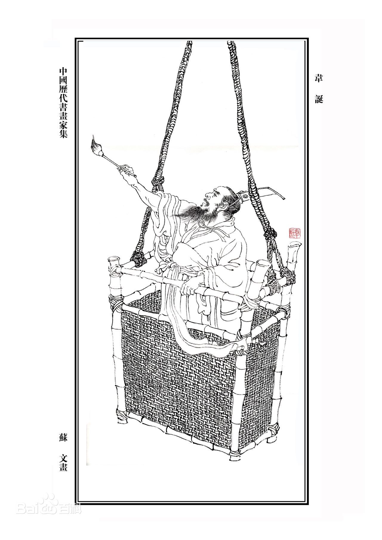 韦诞。字仲将,京兆人。太仆端之子,官至侍中。伏膺于张芝,兼邯郸淳之法,诸书并善,尤精题署。明帝时凌云台初成,令诞题榜,高下异好,宜就加点正,因致危惧,头鬓皆白。既已下,戒子孙无为大字楷法。袁昂云:仲将书如龙盘虎踞,剑拔弩张。张华云:京兆韦诞、子熊,颍川钟繇、子会,并善隶书。初,青龙中,洛阳、许、邺三都宫观始成,诏令仲将大为题署,以为永制,给御笔墨,皆不任用。因曰:蔡邕自矜能书,兼斯、喜之法,非流纨体素,不妄下笔。夫工欲善其事,必先利其器,若用张芝笔,左伯纸及臣墨,兼此三具,又得臣手,然后可以逞经丈之势,方寸干言。然草迹之妙,亚乎索靖也。嘉平五年卒,年七十五。八分、隶、章、飞白入妙,小篆入能。兄康字元将,亦工书。子熊字少季,亦善书。时人云:名父之子,不有二事。世所美焉。