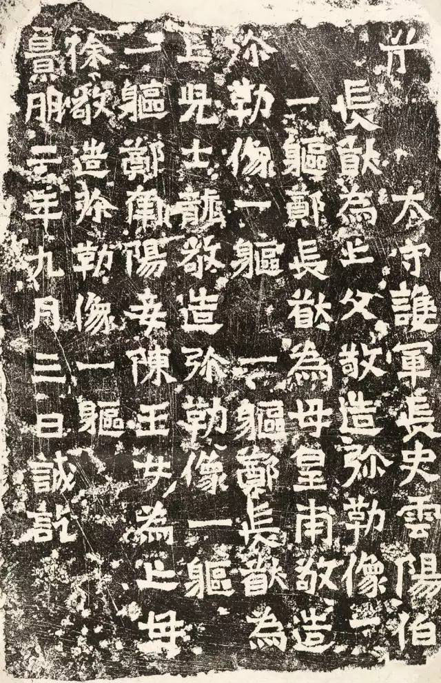 《云阳伯郑长猷为亡父等造像记》,简称《郑长猷造像记》,正书,可见八十四字,书法劲厉朴拙,结体方整,隶意较重。景明二(501)九月刻。古阳洞南壁。正书,8行,一行12字。有翻刻本,其第7行‘敬造’敬字左上点漏刻。