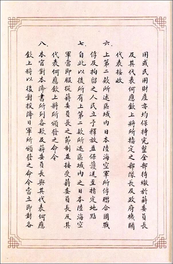 虽然这份投降书是用中文写成的,并且使用了精美的小楷书法,但是从起草到最终誊写都由日本方面的人士完成。在签署仪式上,代表日本签字的是侵华日军总司令冈村宁次,而中国方面的代表则是陆军总司令何应钦。