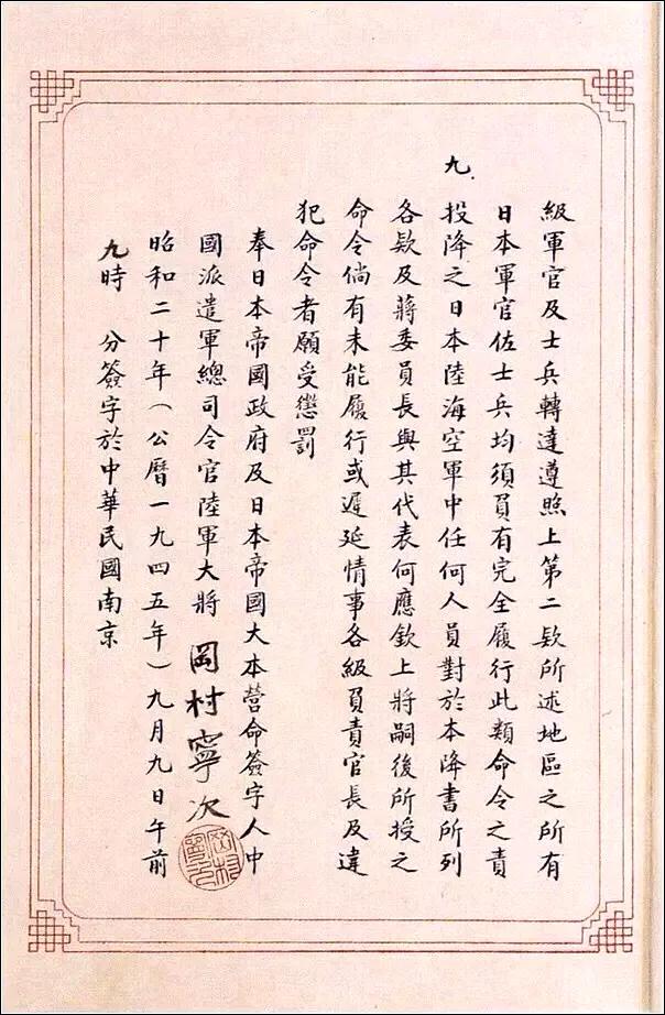 虽然这份投降书是用中文写成的,并且使用了精美的小楷书法,但是从起草到最终誊写都由日本方面的人士完成。在签署仪式上,代表日本签字的是侵华日军总司令冈村宁次,而中国方面的代表则是陆军总司令何应钦。