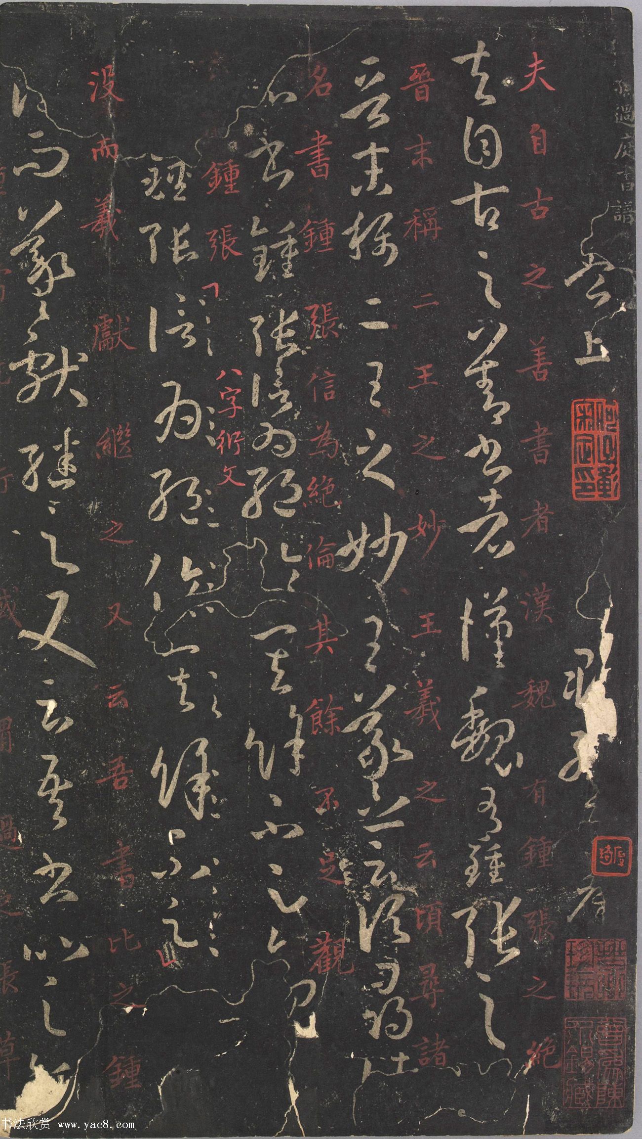 《孙过庭书谱》宋拓本,30.9×35厘米。故宫博物院藏。宋拓孙过庭书谱,法度严密,儁拔刚断,气息高古,于秀逸中寓古劲,存王羲之十七帖之遗风。王志修跋,蒋锡韩朱笔释文。宋元祐二年薛氏所刻,是原石在未断以前拓本,世所稀有。珍品甲。* * *夫自古之善书者,汉魏有钟张之绝,晋末称二王之妙。王羲之云:“顷寻诸名书,钟张信为绝伦,其馀不足观。”可谓钟张云没,而羲献继之。又云:“吾书比之钟张,钟当抗行,或谓过之。张草犹当雁行。然张精熟,池水尽墨,假令寡人耽之若此,未必谢之。”此乃推张迈钟之意也。考其专擅,虽未果于前规;摭以兼通,故无惭于即事。评者云:“彼之四贤,古今特绝;而今不逮古,古质而今妍。”夫质以代兴,妍因俗易。虽书契之作,适以记言;而淳醨一迁,质文三变,驰鹜沿革,物理常然。贵能古不乖时,今不同弊,所谓“文质彬彬。然后君子。”何必易雕宫于穴处,反玉辂于椎轮者乎!又云:“子敬之不及逸少,犹逸少之不及钟张。”意者以为评得其纲纪,而未详其始卒也。且元常专工于隶书,伯英尤精于草体,彼之二美,而逸少兼之。拟草则馀真,比真则长草,虽专工小劣,而博涉多优;总其终始,匪无乖互。谢安素善尺牍,而轻子敬之书。子敬尝作佳书与之,谓必存录,安辄题后答之,甚以为恨。安尝问敬:“卿书何如右军?”答云:“故当胜。”安云:“物论殊不尔。”子敬又答:“时人那得知!”敬虽权以此辞折安所鉴,自称胜父,不亦过乎!且立身扬名,事资尊显,胜母之里,曾参不入。以子敬之豪翰,绍右军之笔札,虽复粗传楷则,实恐未克箕裘。况乃假托神仙,耻崇家范,以斯成学,孰愈面墙!后羲之往都,临行题壁。子敬密拭除之,辄书易其处,私为不恶。羲之还见,乃叹曰:“吾去时真大醉也!”敬乃内惭。是知逸少之比钟张,则专博斯别;子敬之不及逸少,无或疑焉。余志学之年,留心翰墨,味钟张之余烈,挹羲献之前规,极虑专精,时逾二纪。有乖入木之术,无间临池之志。观夫悬针垂露之异,奔雷坠石之奇,鸿飞兽骇之资,鸾舞蛇惊之态,绝岸颓峰之势,临危据槁之形。或重若崩云,或轻如蝉翼。导之则泉注,顿之则山安。纤纤乎似初月之出天涯,落落乎犹众星之列河汉。同自然之妙有,非力运之能成。信可谓“智巧兼优,心手双畅;翰不虚动,下必有由。”一画之间,变起伏于锋杪;一点之内,殊衄挫于毫芒。况云积其点画,乃成其字。曾不傍窥尺牍,俯习寸阴。引班超以为辞,援项籍而自满。任笔为体,聚墨成形。心昏拟效之方,手迷挥运之理,求其妍妙,不亦谬哉!然君子立身,务修其本。杨雄谓:“诗赋小道,壮夫不为。”况复溺思毫厘,沦精翰墨者也!夫潜神对弈,犹标坐隐之名;乐志垂纶,尚体行藏之趣。讵若功宣(一说“定)礼乐,妙拟神仙,犹挻埴之罔穷,与工炉而并运。好异尚奇之士,玩体势之多方;穷微测妙之夫,得推移之奥赜。著述者假其糟粕,藻鉴者挹其菁华,固义理之会归,信贤达之兼善者矣。存精寓赏,岂徒然欤?而东晋士人,互相陶染。至于王谢之族,郗庾之伦,纵不尽其神奇,咸亦挹其风味。去之滋永,斯道逾微。方复闻疑称疑,得末行末,古今阻绝,无所质问;设有所会,缄秘已深;遂令学者茫然,莫知领要,徒见成功之美,不悟所致之由。或乃就分布于累年,向规矩而犹远,图真不悟,习草将迷。假令薄解草书,粗传隶法,则好溺偏固,自阂通规。讵知心手会归,若同源而异派;转用之术,犹共树而分条者乎?加以趋变适时,行书为要;题勒方畐(幅),真乃居先。草不兼真,殆于专谨;真不通草,殊非翰札。真以点画为形质,使转为情性;草以点画为情性,使转为形质。草乖使转,不能成字;真亏点画,犹可记文。回互虽殊,大体相涉。故亦傍通二篆,俯贯八分,包括篇章,涵泳飞白。若毫厘不察,则胡越殊风者焉。至如钟繇隶奇,张芝草圣,此乃专精一体,以致绝伦。伯英不真,而点画狼藉;元常不草,使转纵横。自兹己降,不能兼善者,有所不逮,非专精也。虽篆隶草章,工用多变,济成厥美,各有攸宜:篆尚婉而通,隶欲精而密,草贵流而畅,章务检而便。然后凛之以风神,温之以妍润,鼓之以枯劲,和之以闲雅。故可达其情性,形其哀乐,验燥湿之殊节,千古依然;体老壮之异时,百龄俄顷。嗟乎,不入其门,讵窥其奥者也!又一时而书,有乖有合,合则流媚,乖则雕疏,略言其由,各有其五:神怡务闲,一合也;感惠徇知,二合也;时和气润,三合也;纸墨相发,四合也;偶然欲书,五合也。心遽体留,一乖也;意违势屈,二乖也;风燥日炎,三乖也;纸墨不称,四乖也;情怠手阑,五乖也。乖合之际,优劣互差。得时不如得器,得器不如得志。若五乖同萃,思遏手蒙;五合交臻,神融笔畅。畅无不适,蒙无所从。当仁者得意忘言,罕陈其要;企学者希风叙妙,虽述犹疏。徒立其工,未敷厥旨。不揆庸昧,辄效所明;庶欲弘既往之风规,导将来之器识,除繁去滥,睹迹明心者焉。代有《笔阵图》七行,中画执笔三手,图貌乖舛,点画湮讹。顷见南北流传,疑是右军所制。虽则未详真伪,尚可发启童蒙。既常俗所存,不藉编录。至于诸家势评,多涉浮华,莫不外状其形,内迷其理,今之所撰,亦无取焉。若乃师宜官之高名,徒彰史牒;邯郸淳之令范,空著缣缃。暨乎崔、杜以来,萧、羊已往,代祀绵远,名氏滋繁。或藉甚不渝,人亡业显;或凭附增价,身谢道衰。加以糜蠹不传,搜秘将尽,偶逢缄赏,时亦罕窥,优劣纷纭,殆难覼缕。其有显闻当代,遗迹见存,无俟抑扬,自标先后。且六文之作,肇自轩辕;八体之兴,