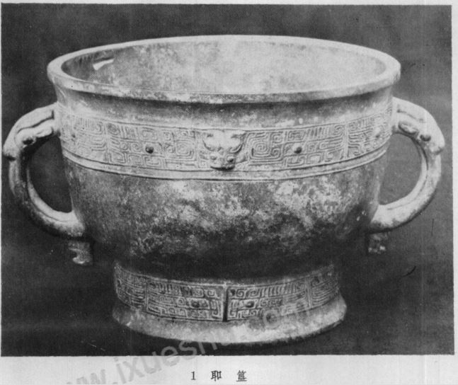 圆腹,圈足,半圆形双耳,耳下垂珥,颈前后铸二对称兽头;每个兽头两侧各饰二夔纹,圈足上饰双夔合成的兽面纹,均匀地构成四组图案。